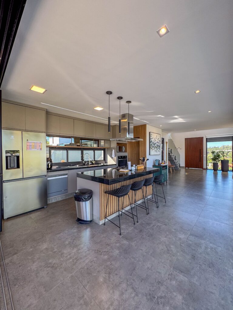 Esse desenho permite que os ambientes sociais se abram para o jardim e a piscina, promovendo uma forte integração com a paisagem, ao mesmo tempo em que garante privacidade e conforto térmico ao longo do dia.