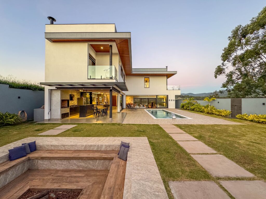 Esse desenho permite que os ambientes sociais se abram para o jardim e a piscina, promovendo uma forte integração com a paisagem, ao mesmo tempo em que garante privacidade e conforto térmico ao longo do dia.