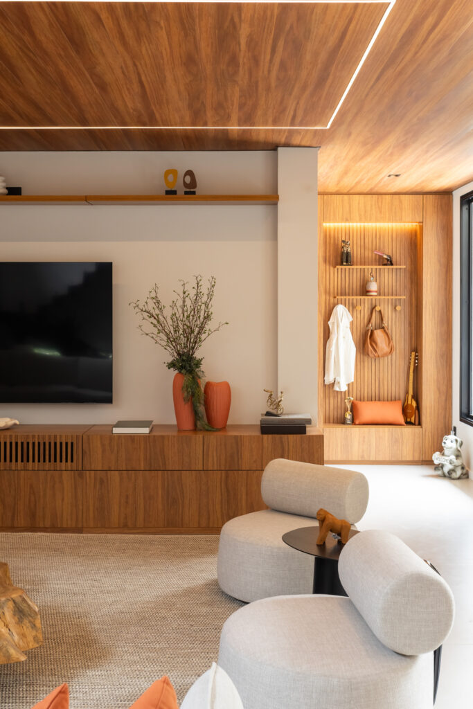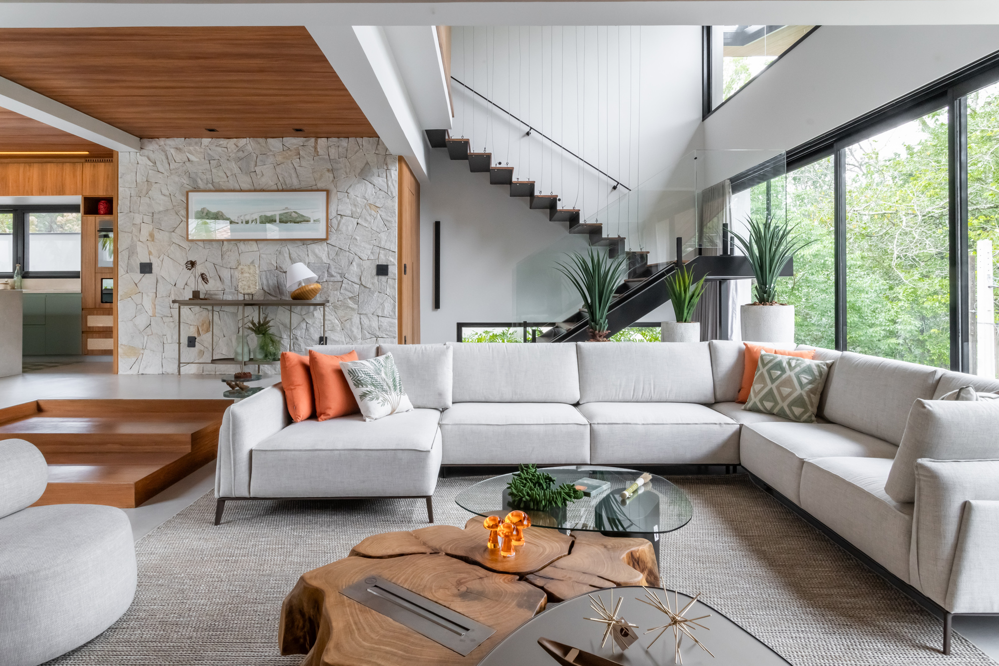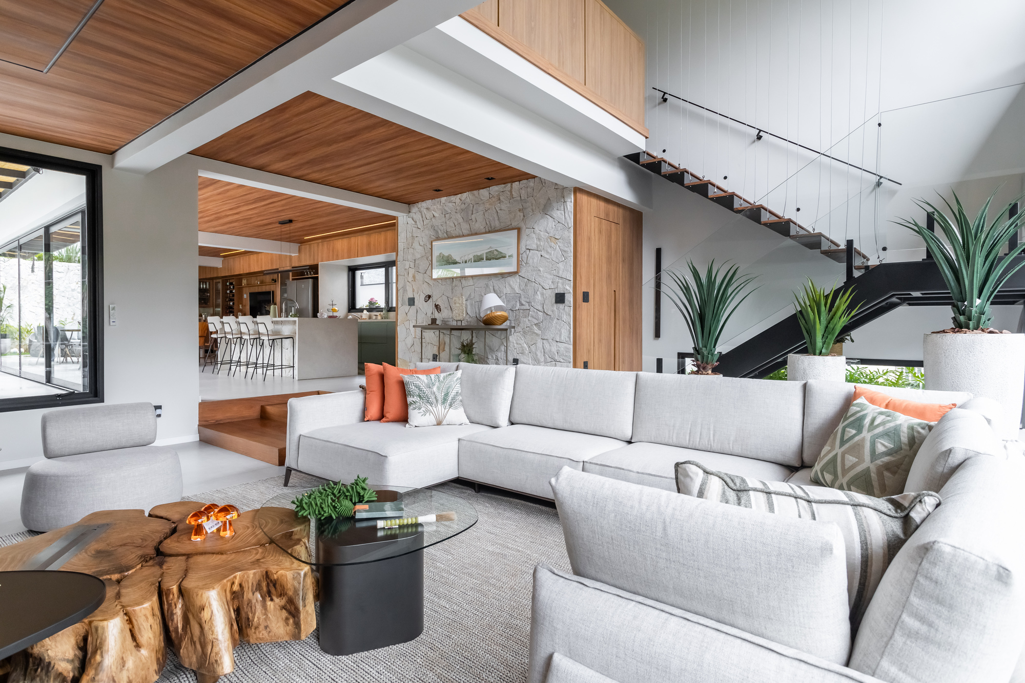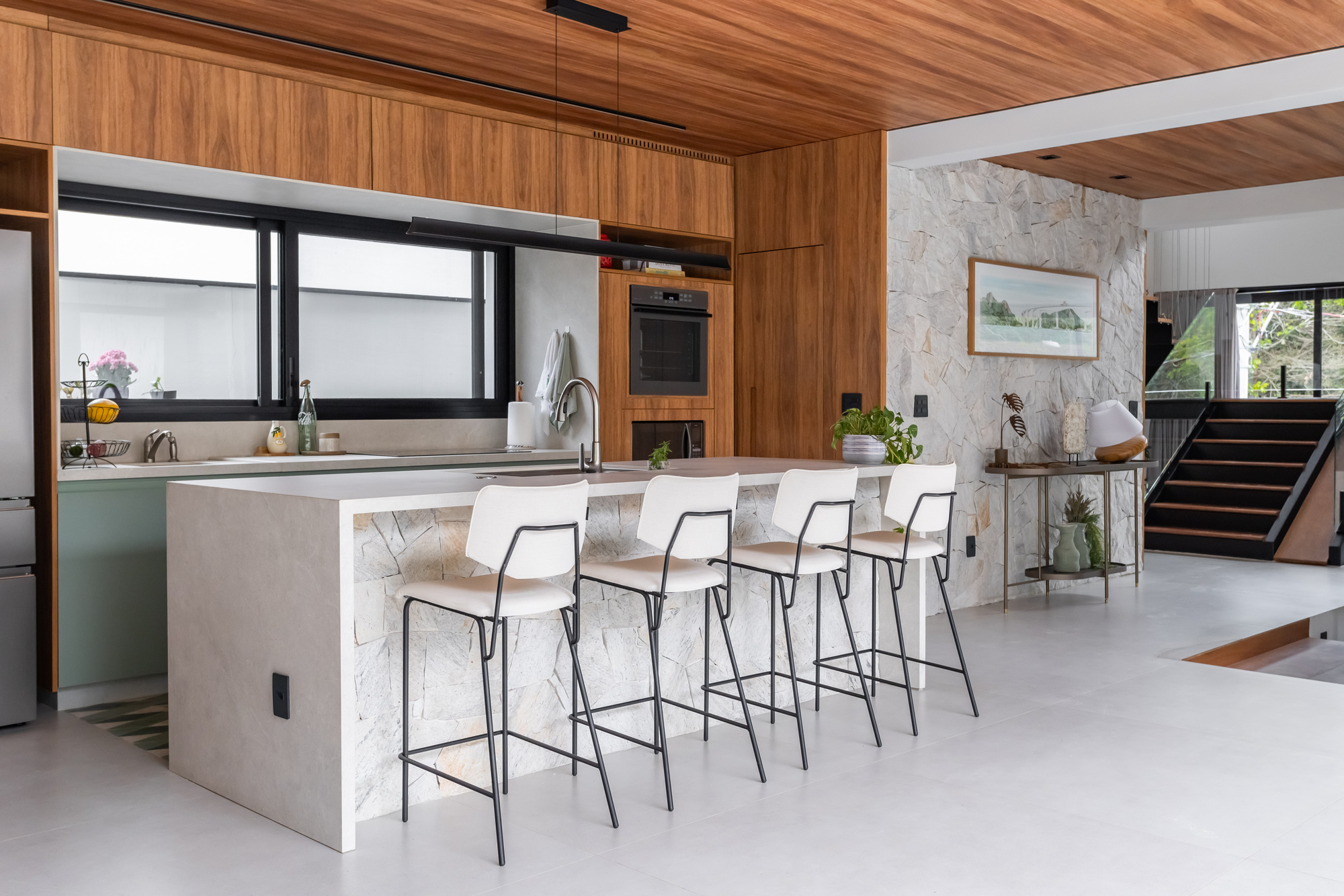 Uma casa pensada para uma família que adora receber amigos e familiares, e a integração dos ambientes favorece essa interação. Arraste para o lado para ver mais.