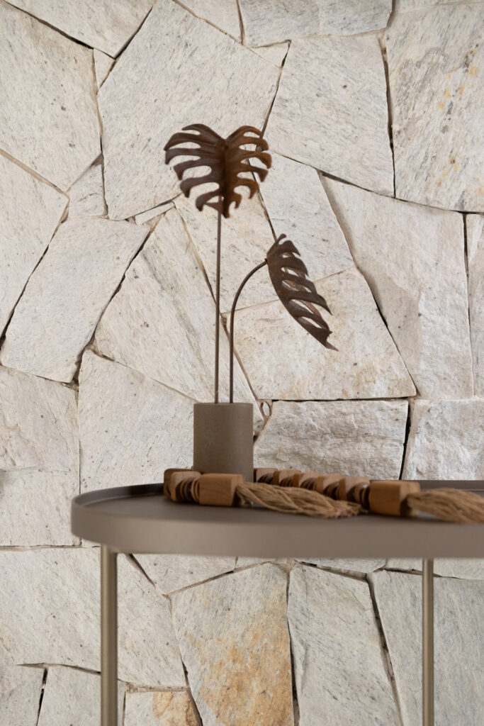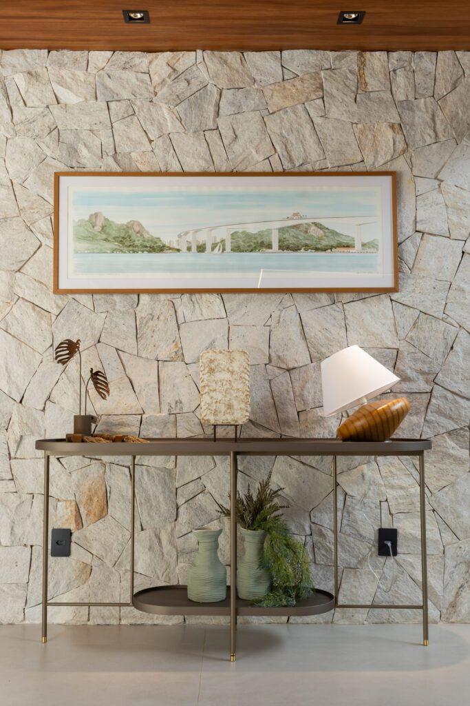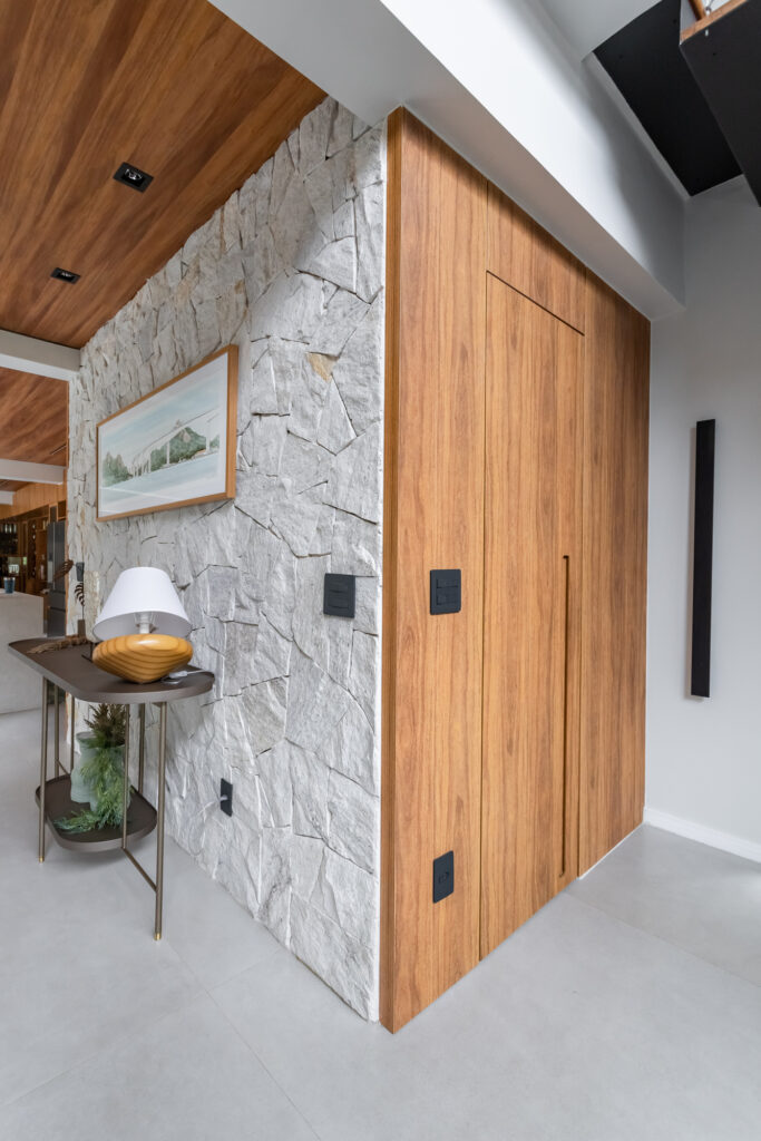 Usamos também pedra mineira branca na sala (assim como em outros pontos) trazendo identidade ao projeto.