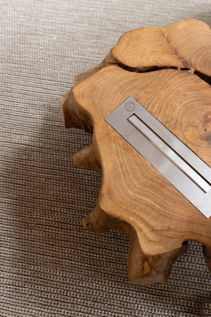 A sala possui uma ampla janela que ilumina os ambientes internos e traz a natureza para dentro da casa.O bosque em frente à casa se transforma em um quadro e contrasta com a madeira do forro, móveis e escada.