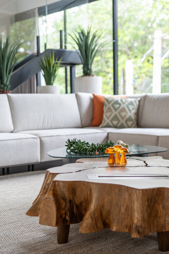 A sala possui uma ampla janela que ilumina os ambientes internos e traz a natureza para dentro da casa.
