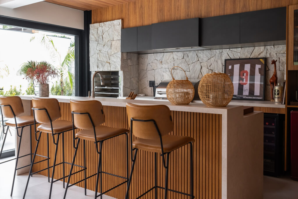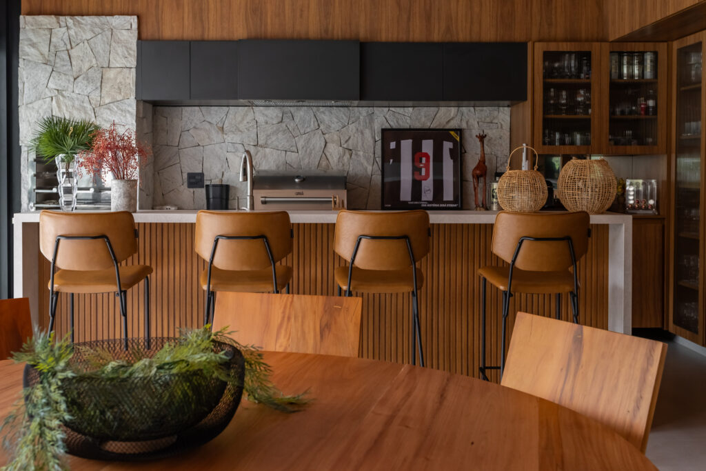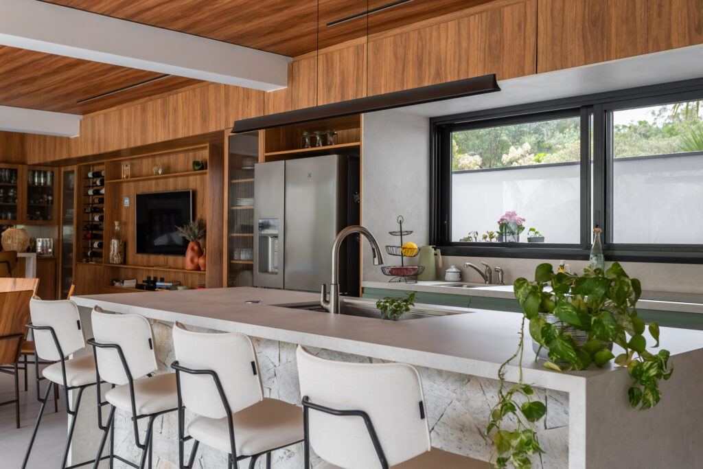 A integração da cozinha com o gourmet foi o que os clientes buscaram ao construir os ambientes sem qualquer separação.