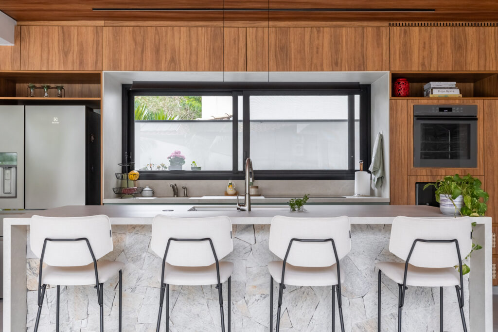 A cozinha foi pensada para ser prática para o dia a dia, por isso criamos um tampo mais funcional sob a janela - com pia e cooktop - e, do lado oposto, está a ilha, que possui uma cuba para lavagem de louças e utensílios.