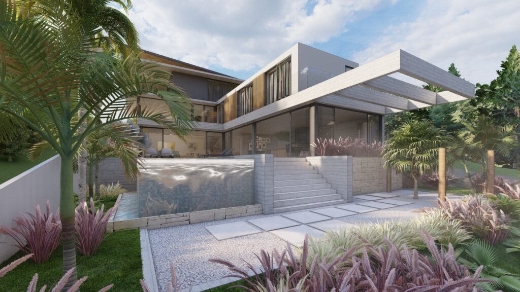 A arquitetura da casa é moderna e minimalista, com linhas retas e muitas janelas para aproveitar ao máximo a paisagem ao redor. O design interno é espaçoso e acolhedor, perfeito para a família, receber os amigos ou para quem busca um refúgio tranquilo.