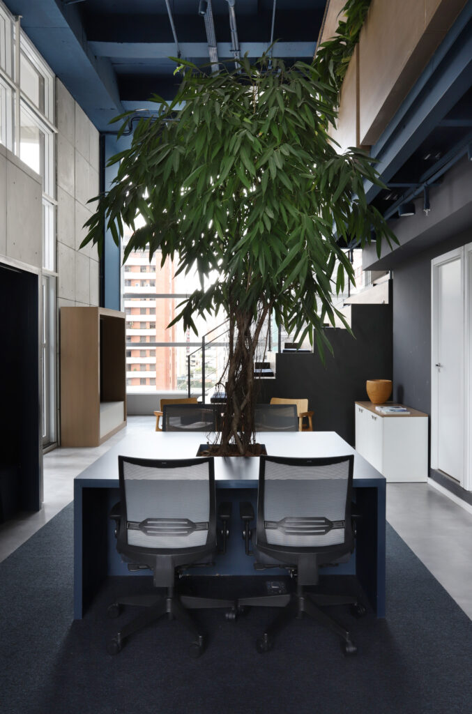 Nossa estratégia foi pensar em design biofílico, com o uso de muita vegetação e espaços muito bem iluminados. Conseguimos que todos os funcionários tivessem contato direto às janelas do edifício.