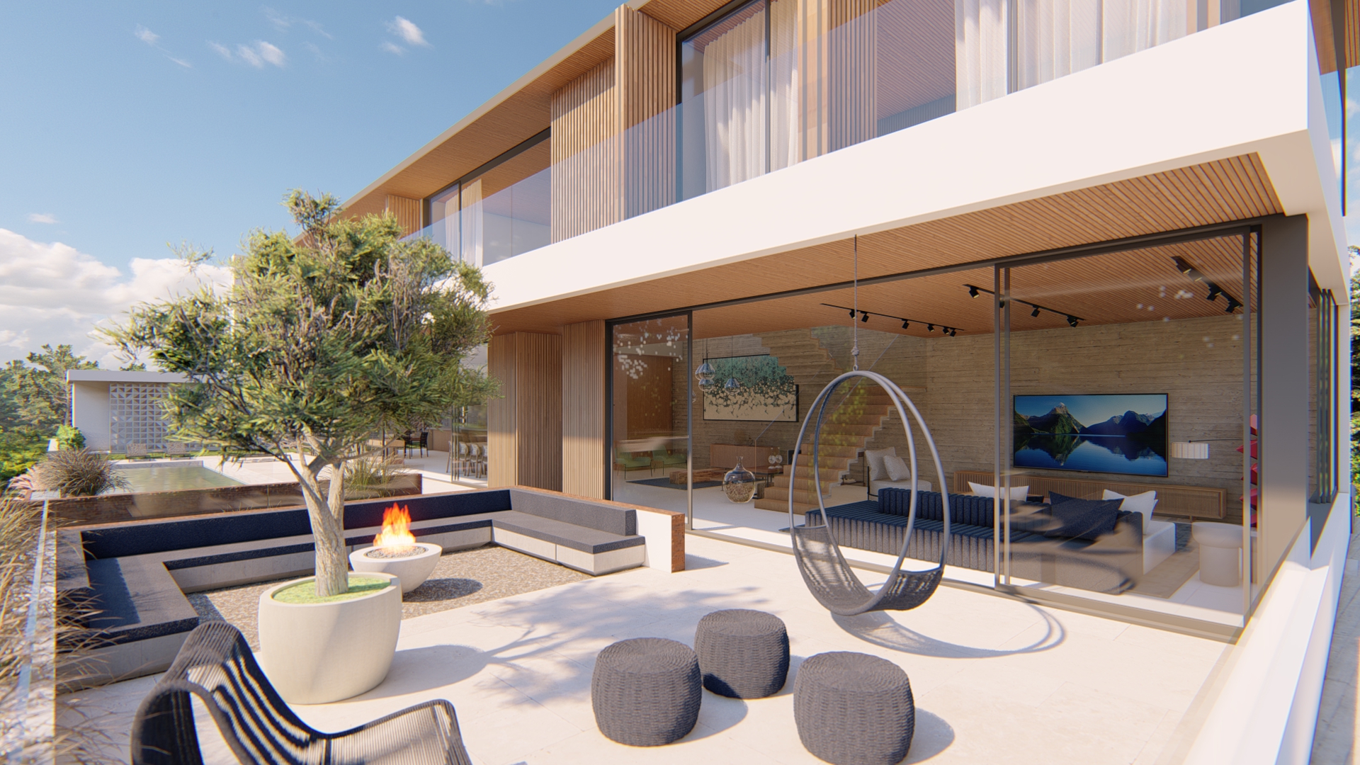 A piscina e as áreas de lazer estão integradas às salas e gourmet, tornando o térreo uma grande área social para eventos com famílias e amigos. Um fogo de chão foi projetado bem próximo à esquina, estrategicamente ligado ao living e com muito acesso à paisagem.