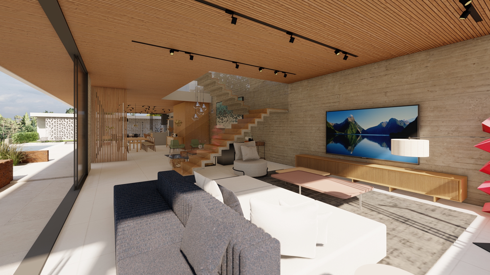 A planta linear favorece a conexão dos espaços. Nosso principal desafio foi tornar superar a distância entre os ambientes de cada ponta da casa, tornando o trajeto agradável.