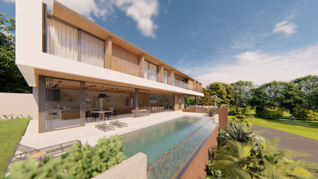 A piscina e as áreas de lazer estão integradas às salas e gourmet, tornando o térreo uma grande área social para eventos com famílias e amigos. Um fogo de chão foi projetado bem próximo à esquina, estrategicamente ligado ao living e com muito acesso à paisagem.