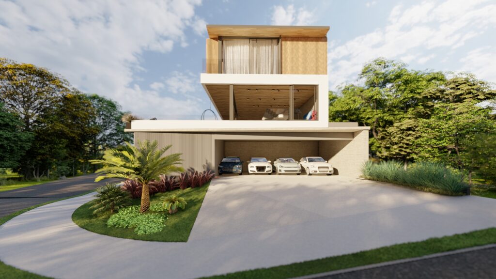 Aproveitamos ao máximo as duas fachadas e a esquina, criando jardins e acessos em pontos diferentes. A entrada social foi projetada pela maior fachada, mostrando toda a dimensão da casa. O acesso de veículos é feito pelo outro lado, igualmente pensado para ser elegante e discreto